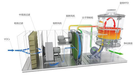 收集廢氣后通過主工藝風(fēng)機的抽吸作用,經(jīng)過干式過濾器前處理進行除塵后進入轉(zhuǎn)輪,經(jīng)轉(zhuǎn)輪吸附達標(biāo)后排放至煙囪;脫附氣經(jīng)RTO風(fēng)機進入RTO爐,脫附濃縮后的廢氣在RTO氧化反應(yīng)裝置中被加熱至760℃以上,氧化成為CO2和H2O,氧化后的高溫氣體經(jīng)蓄熱體儲存,做為給脫附氣體升溫用,經(jīng)過脫附換熱器的高溫氣體還留有較高溫度可預(yù)留管路作為前方涂膠機烘干箱用。