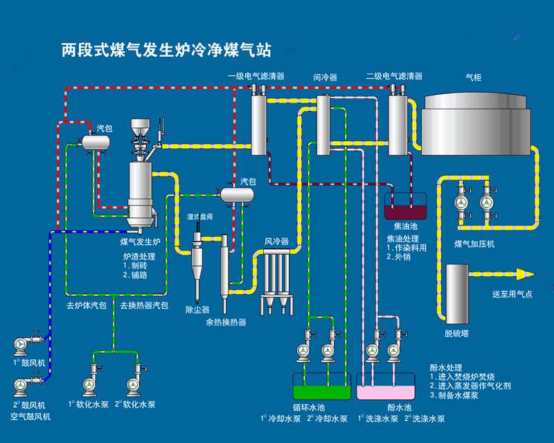 兩段式煤氣發(fā)生爐有上下兩個煤氣出口,可輸出不同熱值的煤氣,其氣化效率和綜合熱效率均比單段爐高,煤炭經(jīng)過爐內(nèi)上段徹底干餾,下段煤氣基本不含焦油,上段煤氣含有少量輕質(zhì)焦油,不易堵塞管道,兩段爐煤氣熱值高而且穩(wěn)定,操作彈性大,自動化程度高,勞動強度低。兩段爐煤氣站不污染環(huán)境,節(jié)水顯著,占地面積小,長期運行成本低。