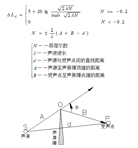 從上式中可以看出,聲屏障的繞射損失完全取決于菲涅爾指數(shù)N,即取決于聲源和受聲點(diǎn)之間的聲程差,聲程差A(yù)+B-d越大,λ聲波波長越?。l率越高)則聲屏障的繞射損失越大,也就是說聲屏障的效果越好。