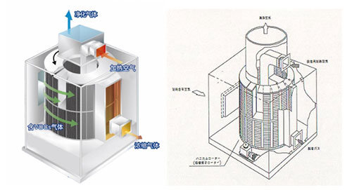 降低收集廢氣后通過主工藝風機的抽吸作用,經(jīng)過前處理干式過濾器進行過濾后進入轉輪,經(jīng)轉輪吸附達標后排放至煙囪;脫附氣經(jīng)CO風機進入CO爐,脫附濃縮后的廢氣在CO反應裝置中被加熱至300℃以上,氧化成為CO2和H2O,氧化后的高溫氣體經(jīng)脫附換熱器做為給脫附氣體升溫用。