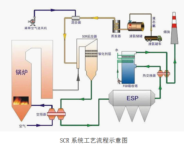? ? ? ?工業(yè)上,燃煤燃?xì)釹CR脫硝的還原劑主要是氨。液氨或氨水由蒸發(fā)器蒸發(fā)后噴入系統(tǒng)中,在催化劑的作用下,氨氣將煙氣中的NOx還原為N2和水。其化學(xué)反應(yīng)方程式為催化劑